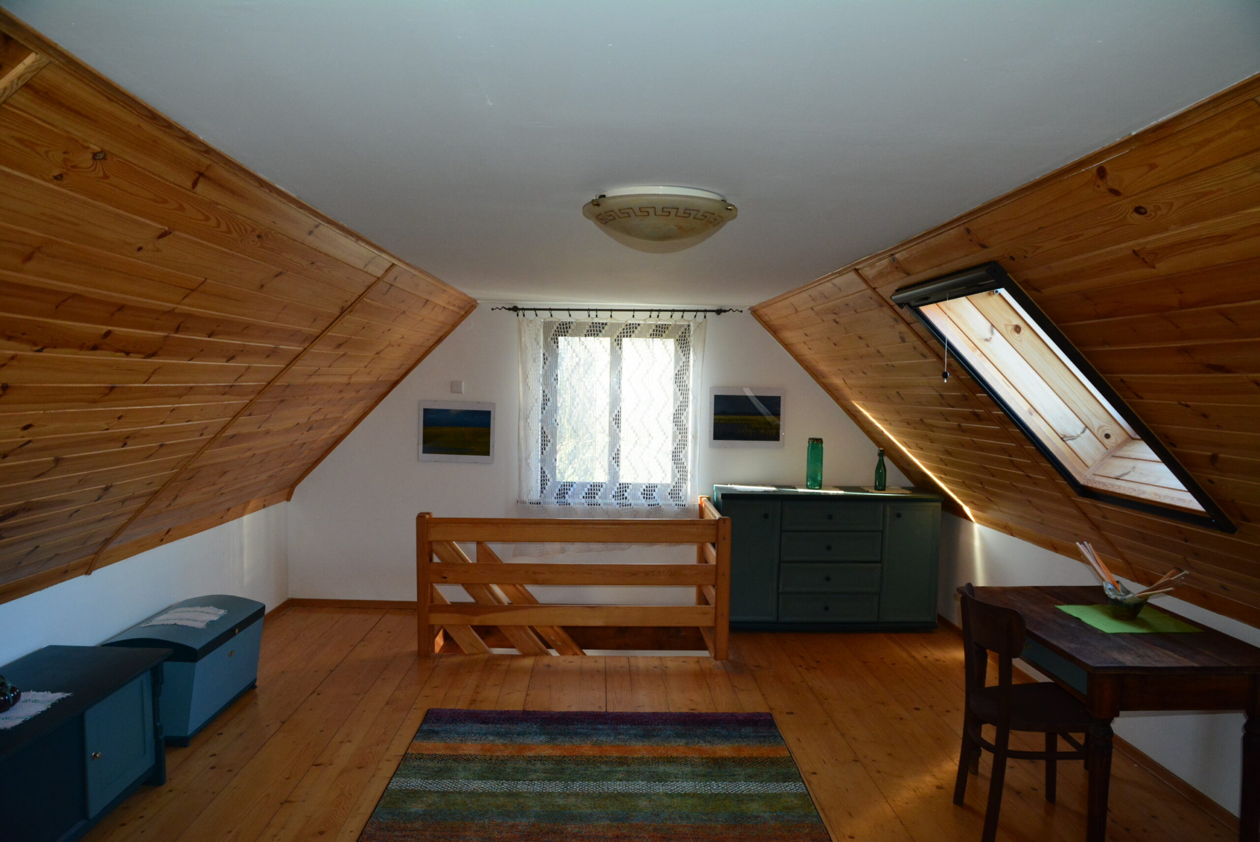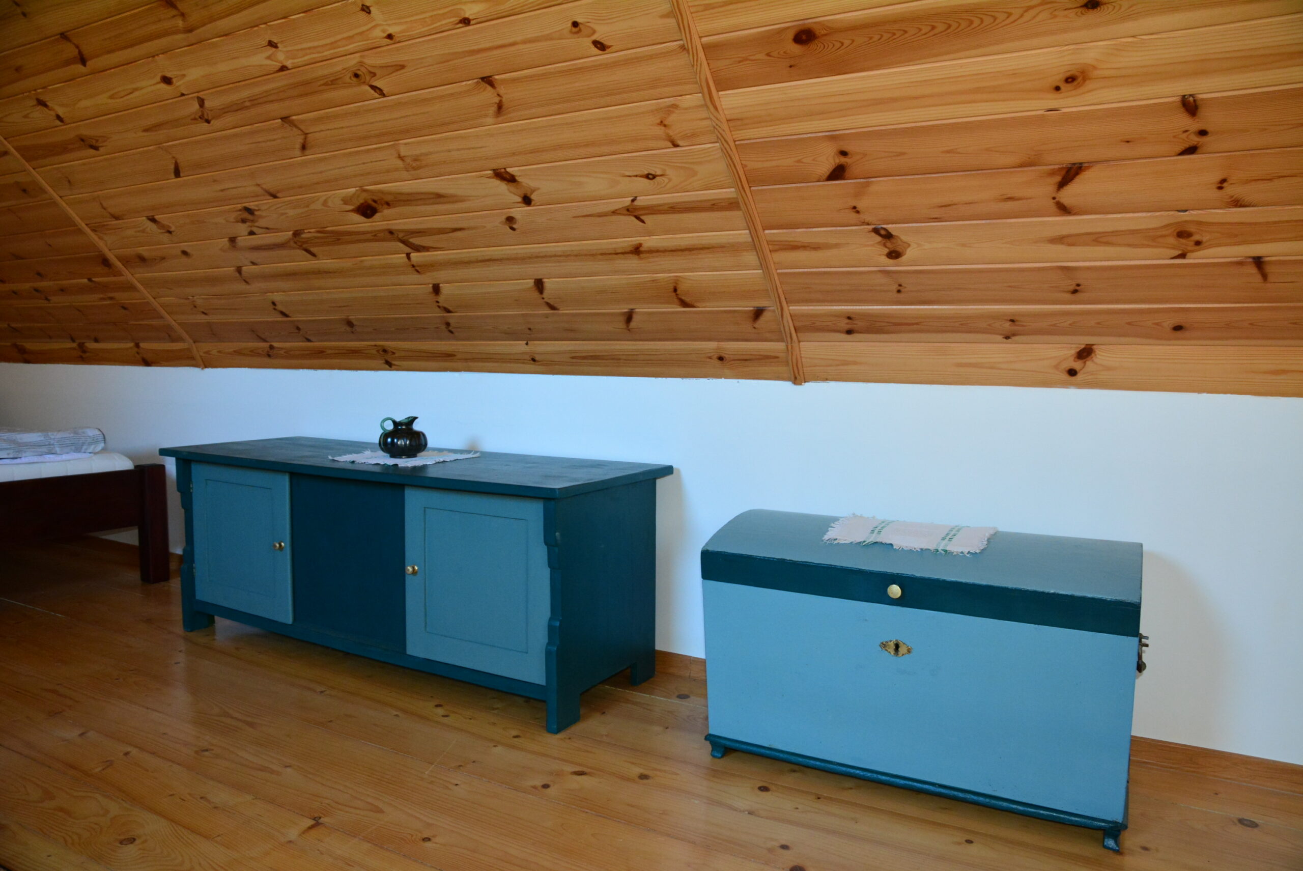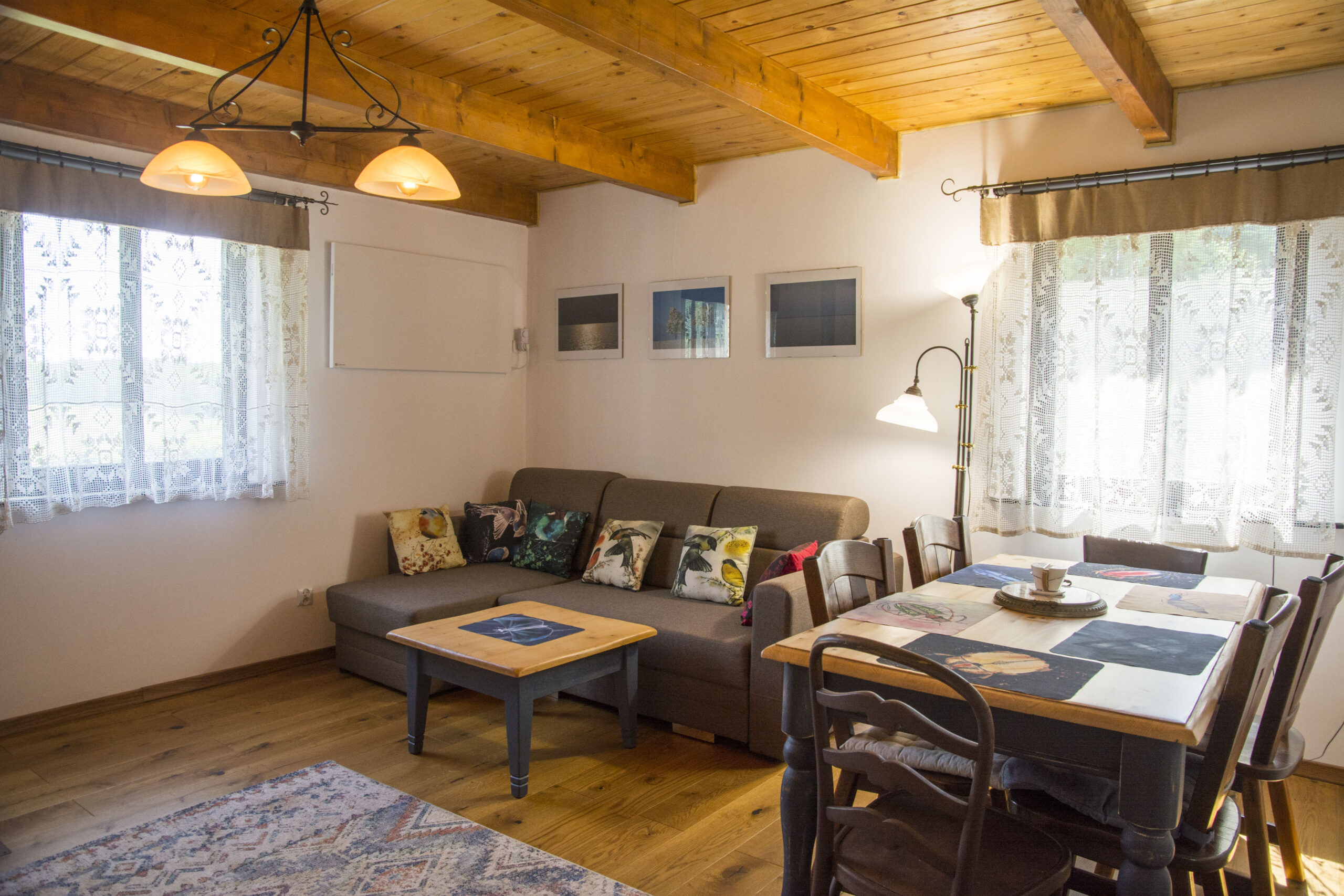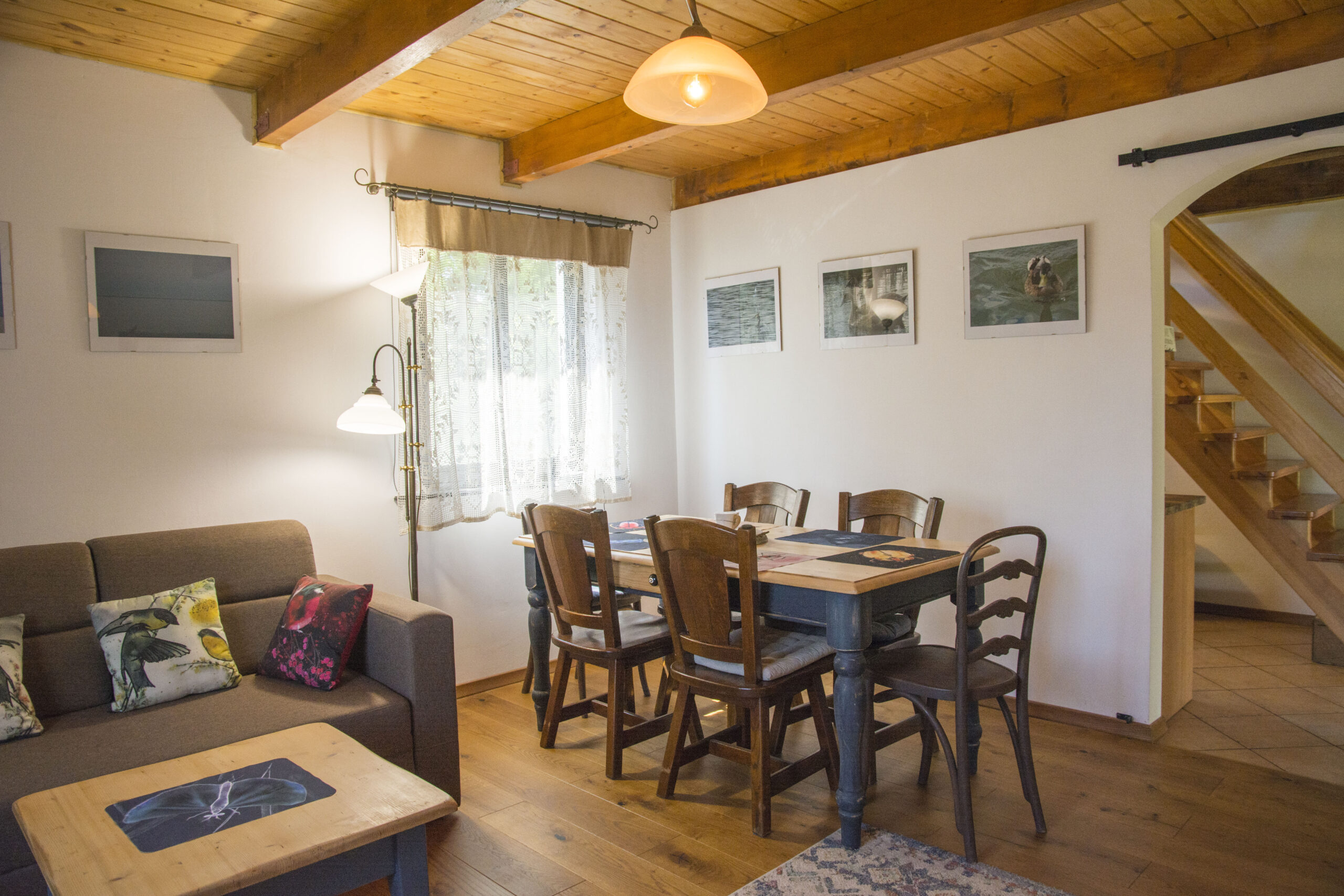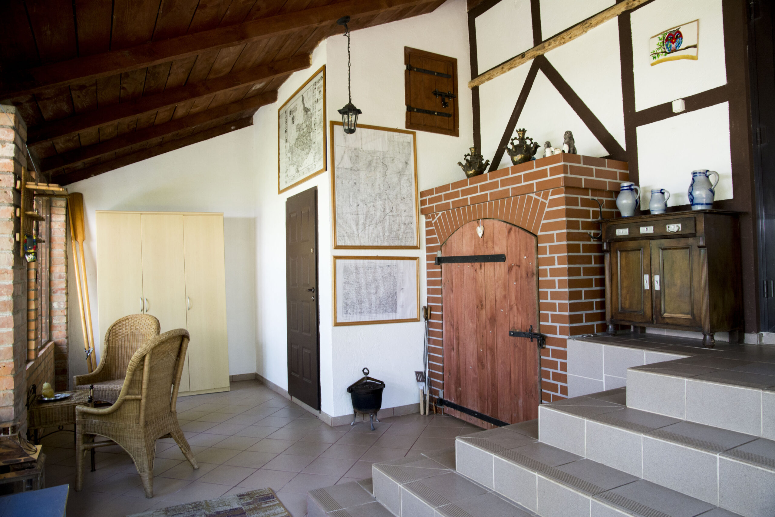 Dom posiada jedną dużą sypialnię na poddaszu z dwoma podwójnymi łóżkami. Na dole mieści się kuchnia oraz salon z kanapą rozkładaną dla dwóch osób. Do domu wchodzi się przez oszkloną werandę z której wchodzi się do łazienki i w której jest też część wypoczynkowa.