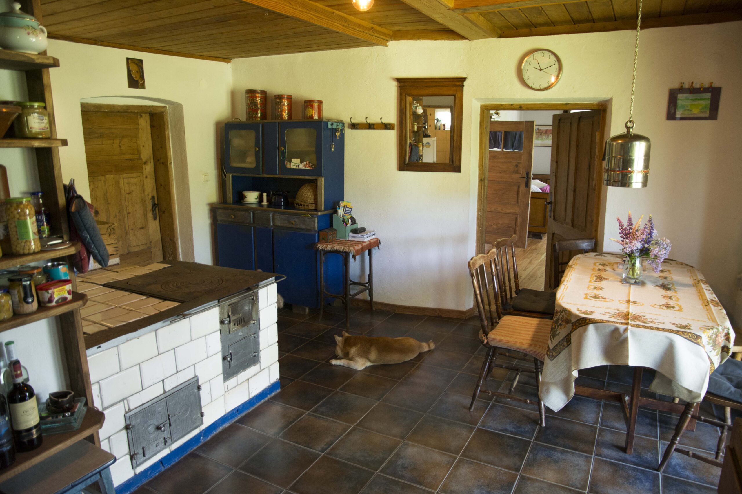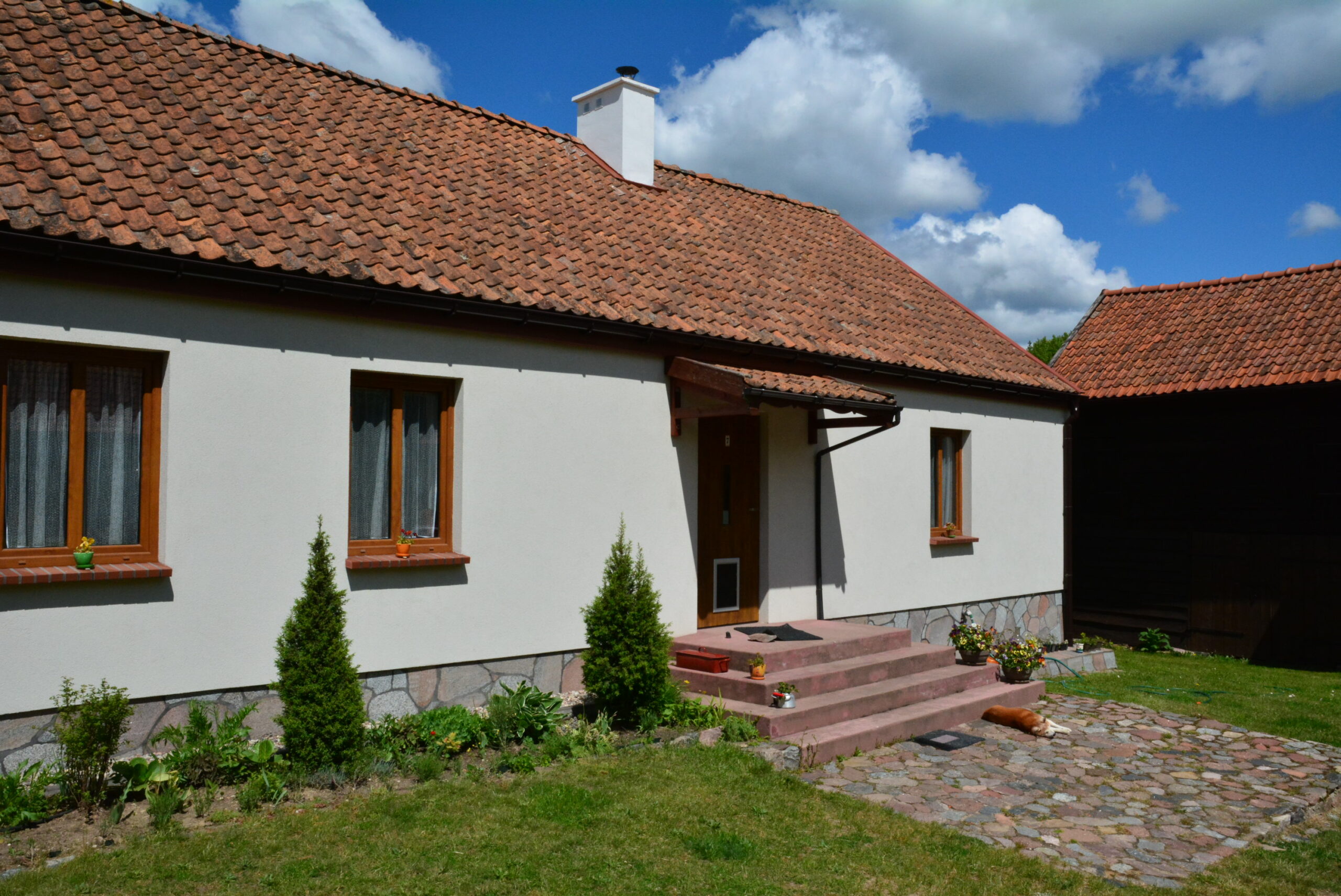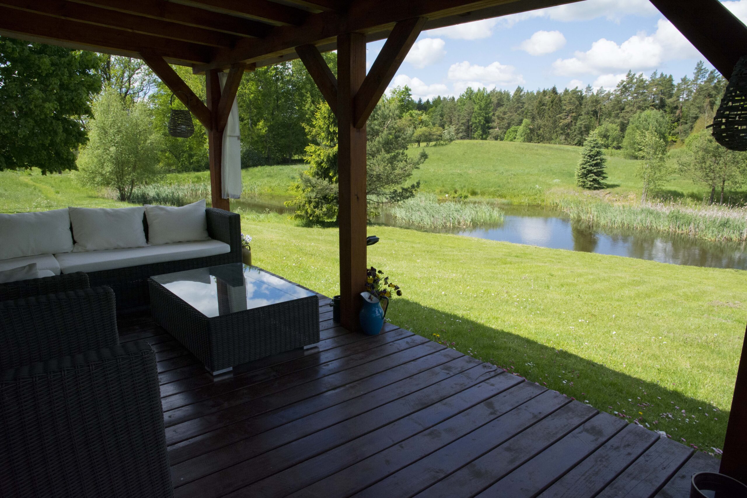 Dom przeznaczony jest dla maksymalnie 6 osób w cenie podstawowej. W 3 sypialniach jest 6 miejsc do spania. W sypialni pierwszej jest jedno łóżko podwójne. Druga sypialnia mieści dwa łóżka pojedyncze. Sypialnia trzecia, największa, wyposażona jest w dwa pojedyncze łóżka i tam zwyczajowo dostawiamy dodatkowe łożka, jeżeli jest taka potrzeba. Częścią wspólną dla gości jest kuchnia ze stołem jadalnianym i wyjściem na przestronny taras, wyposażonym w komfortowe meble ogrodowe. Z tarasu jest widok na staw, las i łąki.